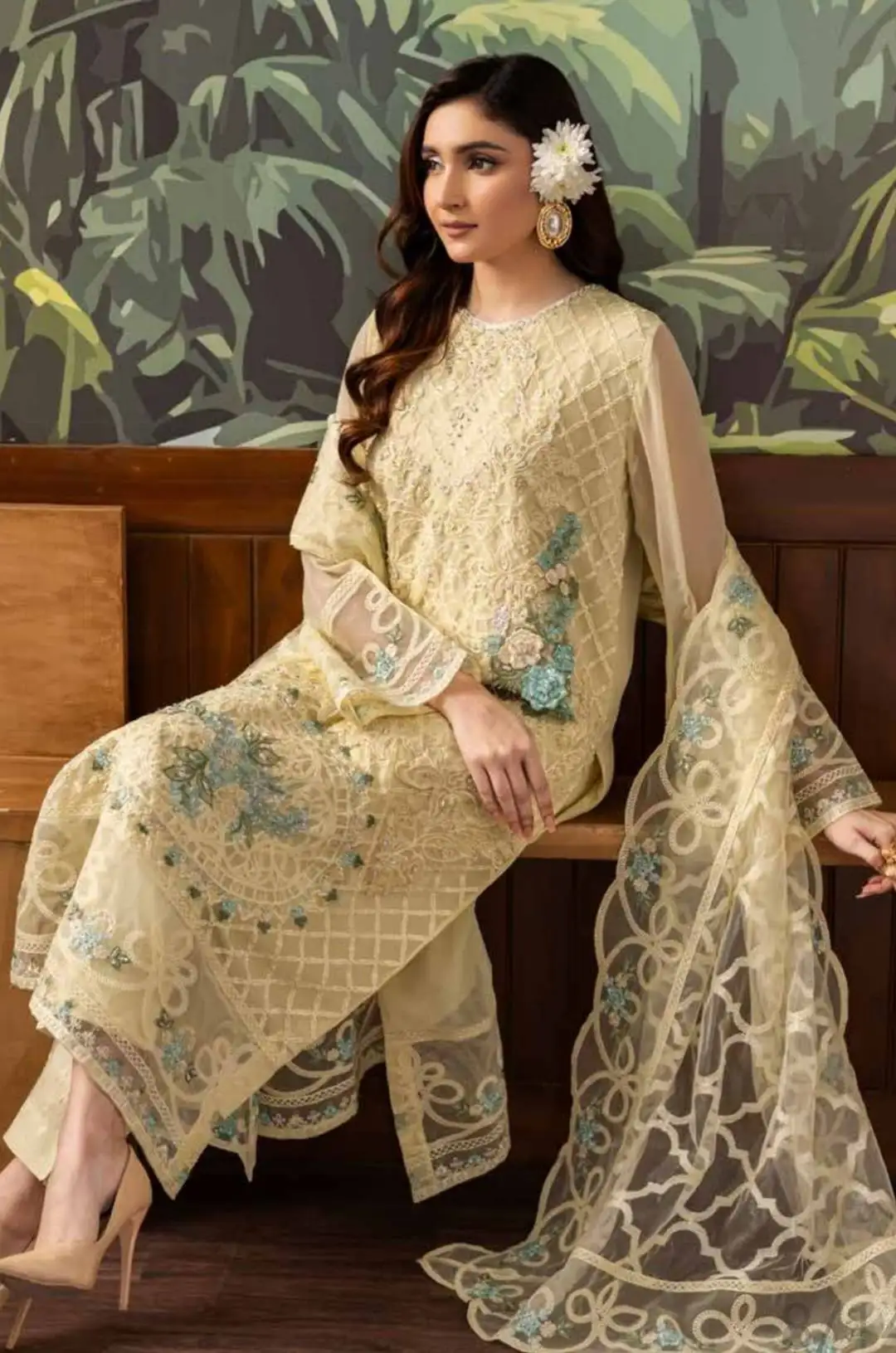 • Embroidered Luxury Pure Chiffon Semi Stitched Shirt with Handwork