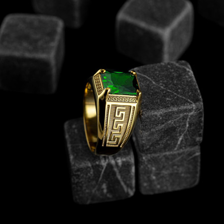 Green Emerald 21K Gold Men Wedding Signet Ring, Emerald Stone Statement Ring